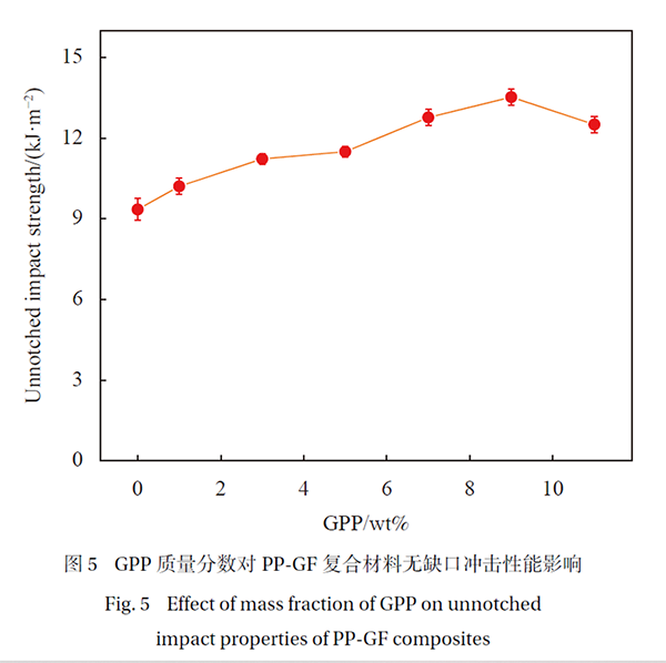 圖5顯示,隨著GPP添加量從0wt%增加至9wt%,無缺口沖擊性能逐步提升,最佳效果出現在9wt%處,隨后略有下降。這表明GPP有效改善了玻璃纖維與聚丙烯的界面相容性,提升了復合材料的抗撞擊能力。但過量添加GPP會削弱聚丙烯分子鏈間的相互作用,導致沖擊性能下降。