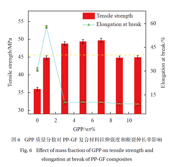 圖6 表示添加GPP 的PP-GF 復合材料試樣的拉伸強度和斷裂伸長率。隨著GPP 的添加,拉伸強度先增加后下降,在添加7wt% 相容劑時拉伸強度最大,說明相容劑有助于提高復合材料拉伸強度,增加了玻璃纖維在聚丙烯中的應力傳遞,提高了拉伸破壞能力。在相容劑大于9wt% 后拉伸強度趨于穩定,結果表明拉伸破壞主要是玻璃纖維脫粘或玻璃纖維斷裂引起的,GPP 添加量超過9wt% 后不能引起界面強度的提高。在添加1wt% 相容劑時,斷裂伸長率有較大提高,但隨著相容劑添加大于3wt% 后,斷裂伸長率在下降后且保持了穩定,表明復合材料中相容劑在一定添加后界面應變也趨于穩定。