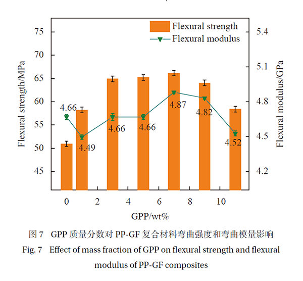 圖7顯示,隨著GPP含量的增加,PP-GF復合材料的彎曲強度和彎曲模量持續上升,直至7wt%時達到最優。這歸因于GPP增強了界面強度,穩定了玻璃纖維在聚丙烯基體中的分布,從而提高了復合材料的承載性能。然而,GPP含量超過7wt%后,聚丙烯分子鏈間的相互作用減弱,導致彎曲強度下降。