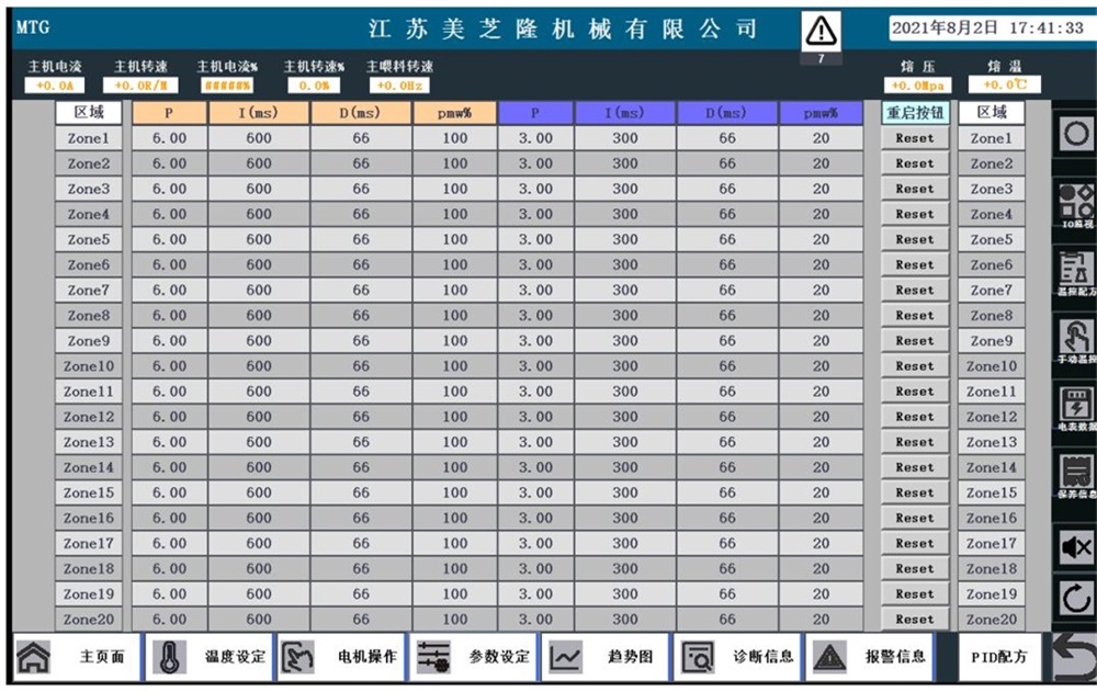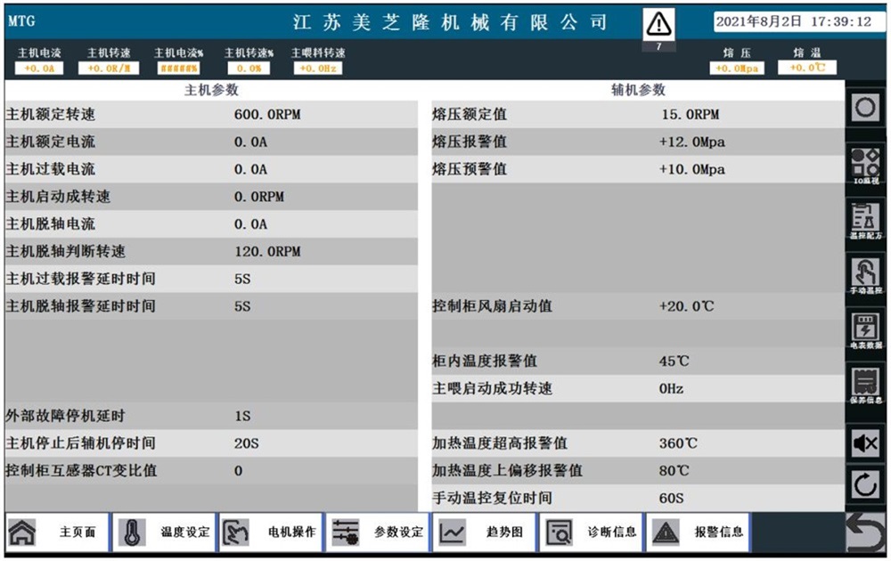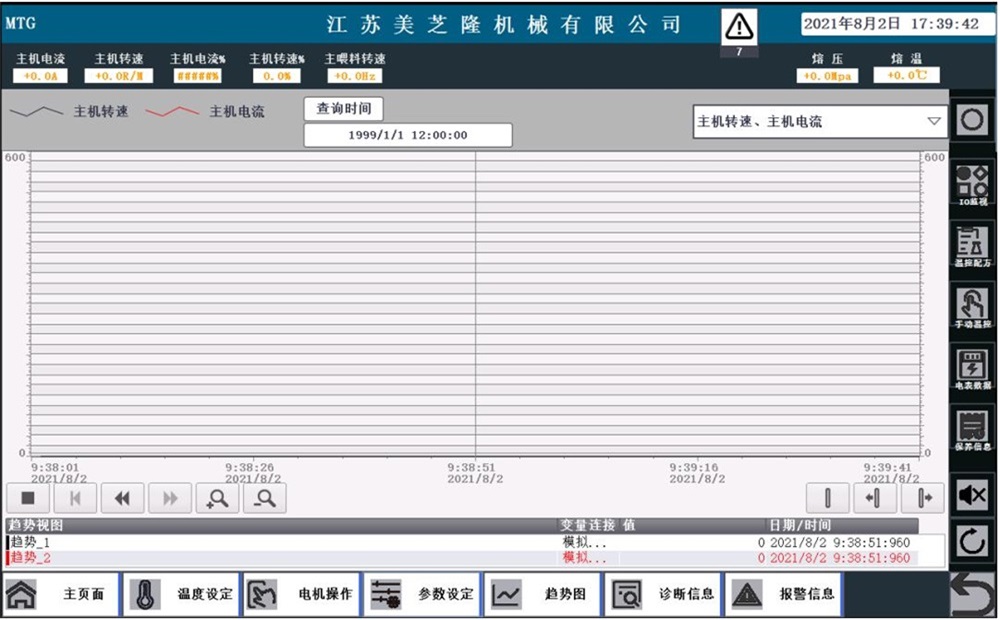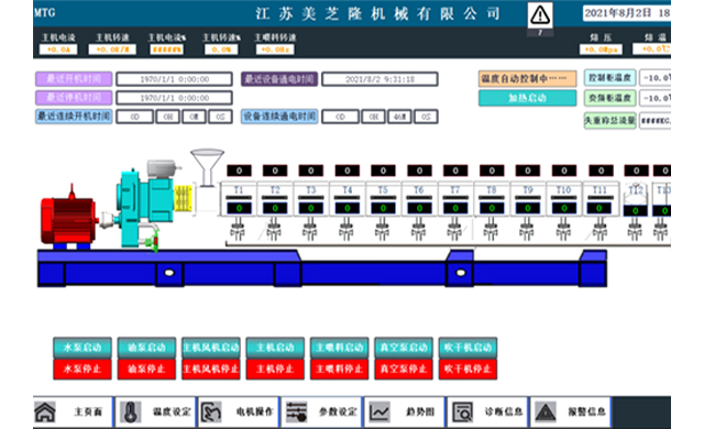 ● 在主機觸摸屏上監控主機轉速、主機電流、各段溫控設定值和實際值、熔體壓力實際值等,并有動態曲線顯示、參數輸入、參數保存;故障報警優先顯示,報警信息可記錄和調閱