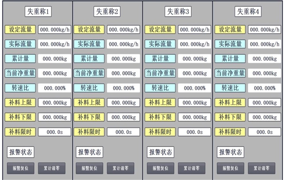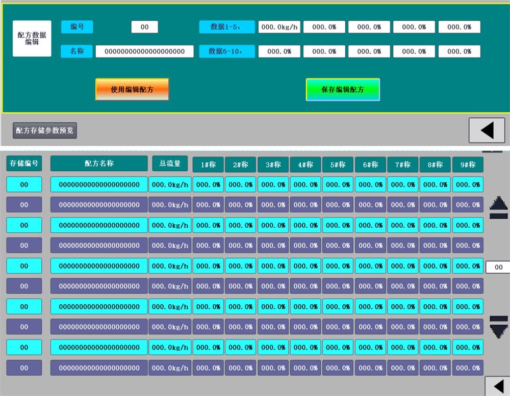 ● 具備物料配方管理功能,在觸摸屏上可調用、增加生產配方,生產人員只需要選取生產的配方號,輸入生產小時產量,就能自動計算出需要參與的每臺稱的運行參數,并把以上數據給予對應的失重稱,實現一鍵開機。