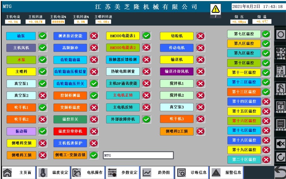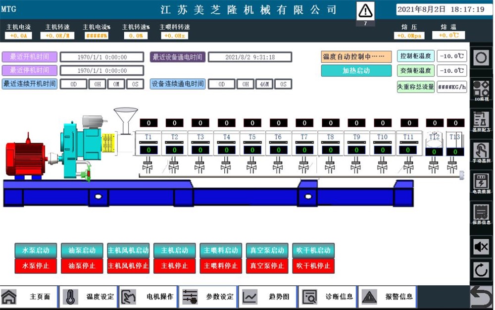 ● 采用西門子TP1200觸摸屏,12寸真彩,高對比度,高壽命,高靈敏度操作;可在擠出機觸摸屏上實現主機、失重稱、輔機的啟停、參數設定和運行狀態監控。