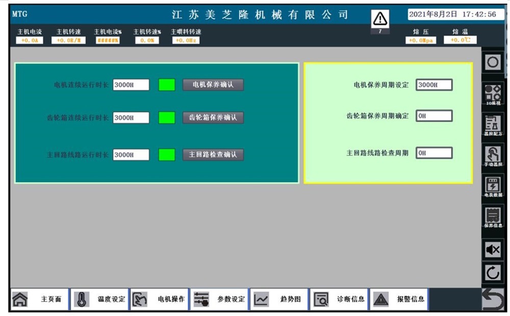 ● 實際統計擠出機開機時間和運行時間,減速箱、主電機、控制柜按運行時間,達到保養維護周期后及時提醒設備維護人員對相應設備進行維護